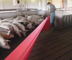 Tap the pull rod on the floor to create a bit of movement in the fabric as you move around behind the pigs. The optical illusion of the wall moving behind the pigs stimulates them to move away from the curtain. The constant tension on the curtain maintains a clear directional option for the pigs to move in. It is important that the curtain sweeps across the pen as close to the floor as comfortable for you, otherwise the pigs may escape under the fabric. This is not cause for serious concern, as you only need to repeat the process until all pigs have moved forward. This operator error does not occur often and is not a functional problem of the product.