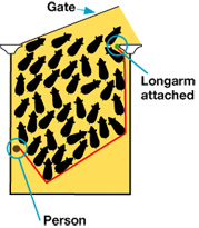 LONGARM is an accessory tool for the auto sorters as it aids in bringing those last few timid pigs to the scale without harassment. This leaves both the operator and the pigs calmer to finish the weighing. Hook the LONGARM as close to the scale as possible. Sweep the pen with the LONGARM gate encouraging the pigs to come to the scale. Stay back a little from the scale to allow the pigs to move about freely then slowly edge closer to the scale until all pigs have been processed through the scale.